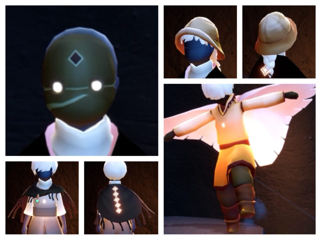 主に髪型、ケープ、お面、服装、感情表現(後ろを振り返り一息つく感じ)が入手可能です