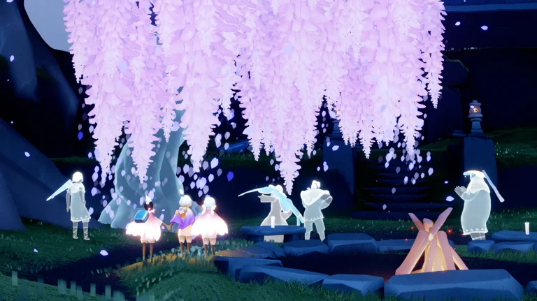 蕾はやがて花開き満開を迎えます。紫の花びらが優しく舞い始めると、光のかけらもともに舞いふり、花木を愛でながら光のかけらを集められるでしょう。イベントの終わりまで、鮮やかな花々はその身を滝のように揺らすでしょうが、最後の数日は光のかけらは集められません