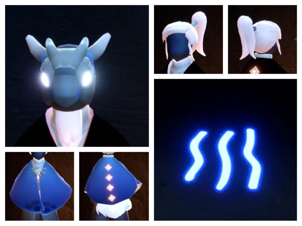 主に髪型、ケープ、お面、感情表現(深呼吸)が入手可能です